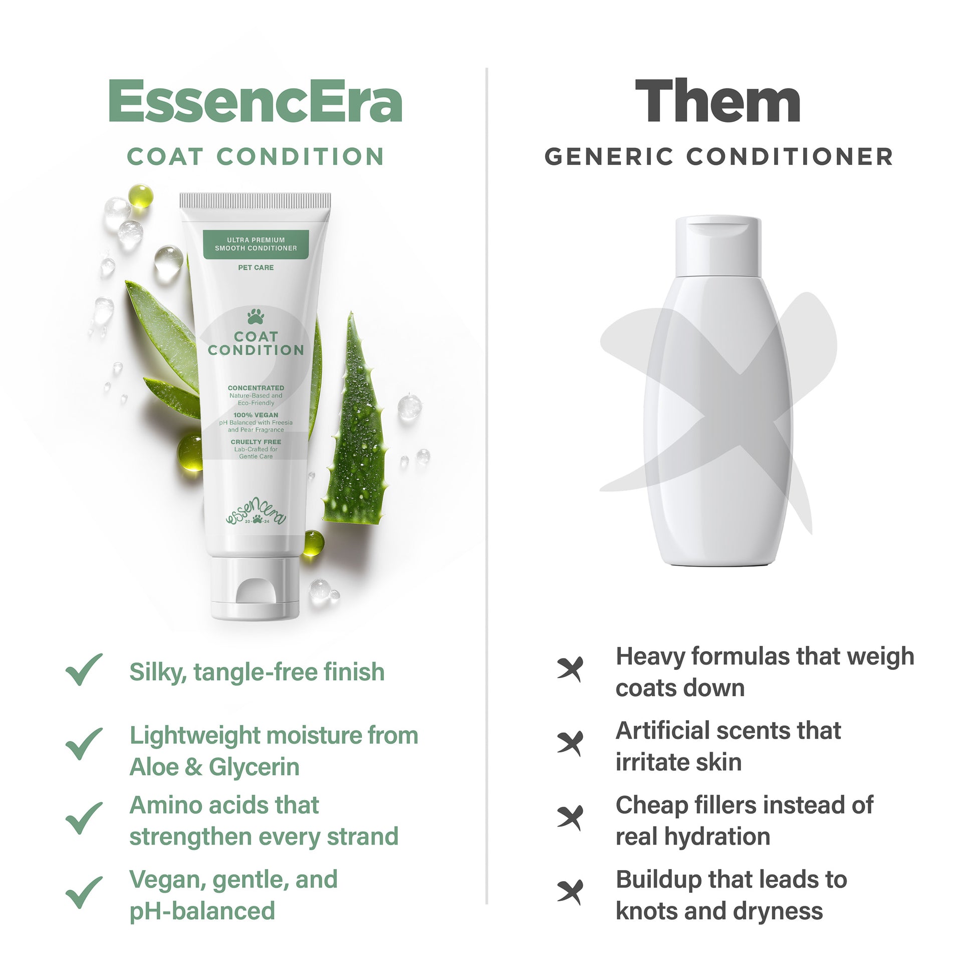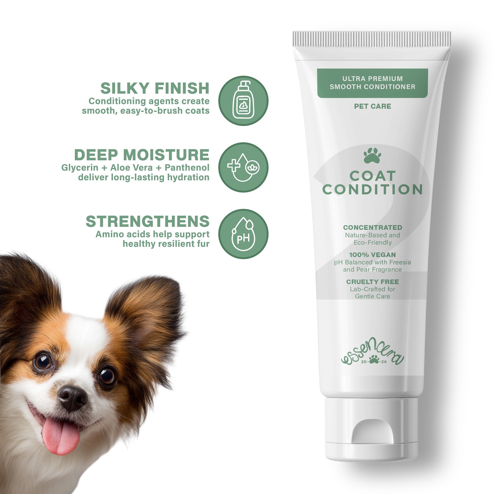 Coat Condition is Step 2 of the Essencera grooming ritual and the moment your pet’s coat comes back to life. This is salon level conditioning designed for softness without residue. Made for thick coats, curly coats, long coats, doodles, shedders, and every pet whose fur deserves to feel luxurious.