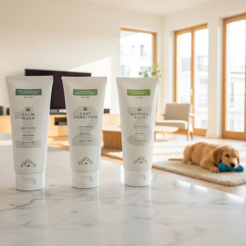 The Gentle Start Bundle is a 3-step care routine built for puppies, seniors, rescues, and sensitive pets. It’s your safest first step into clean, conscious grooming.
