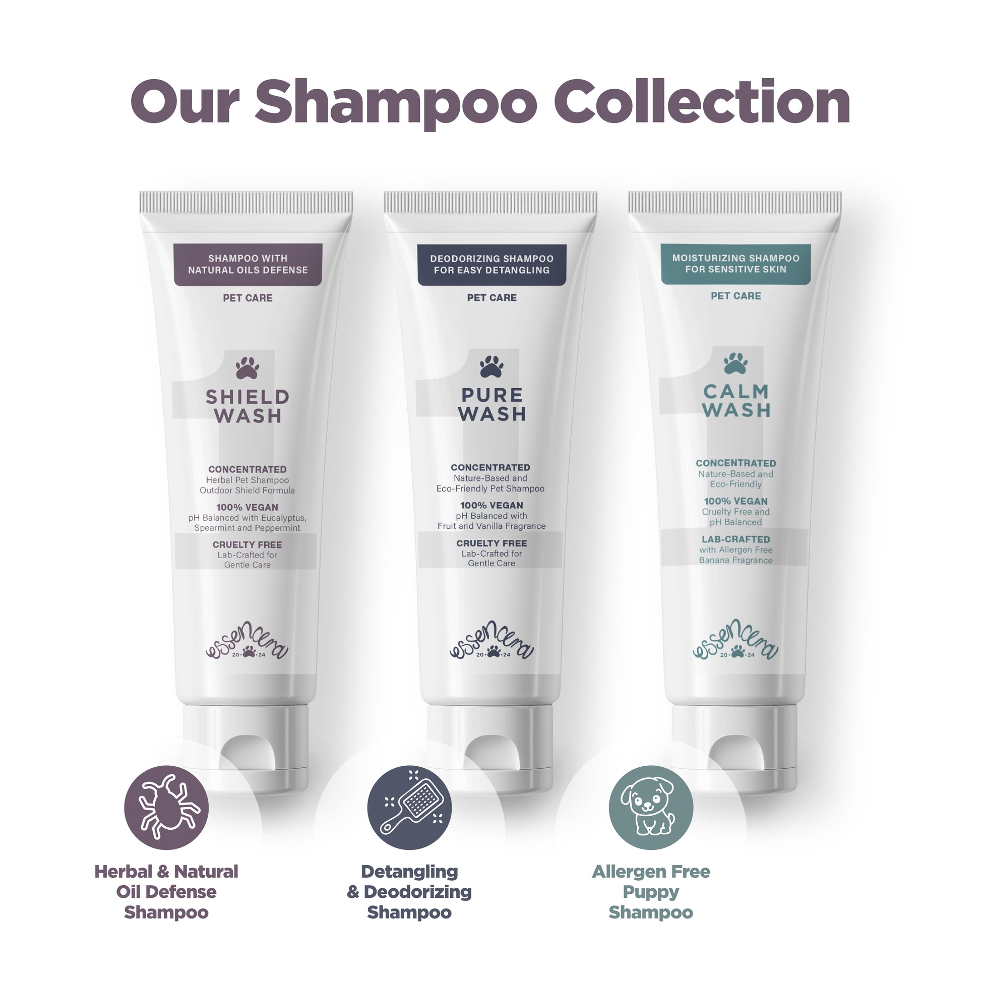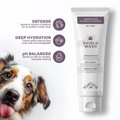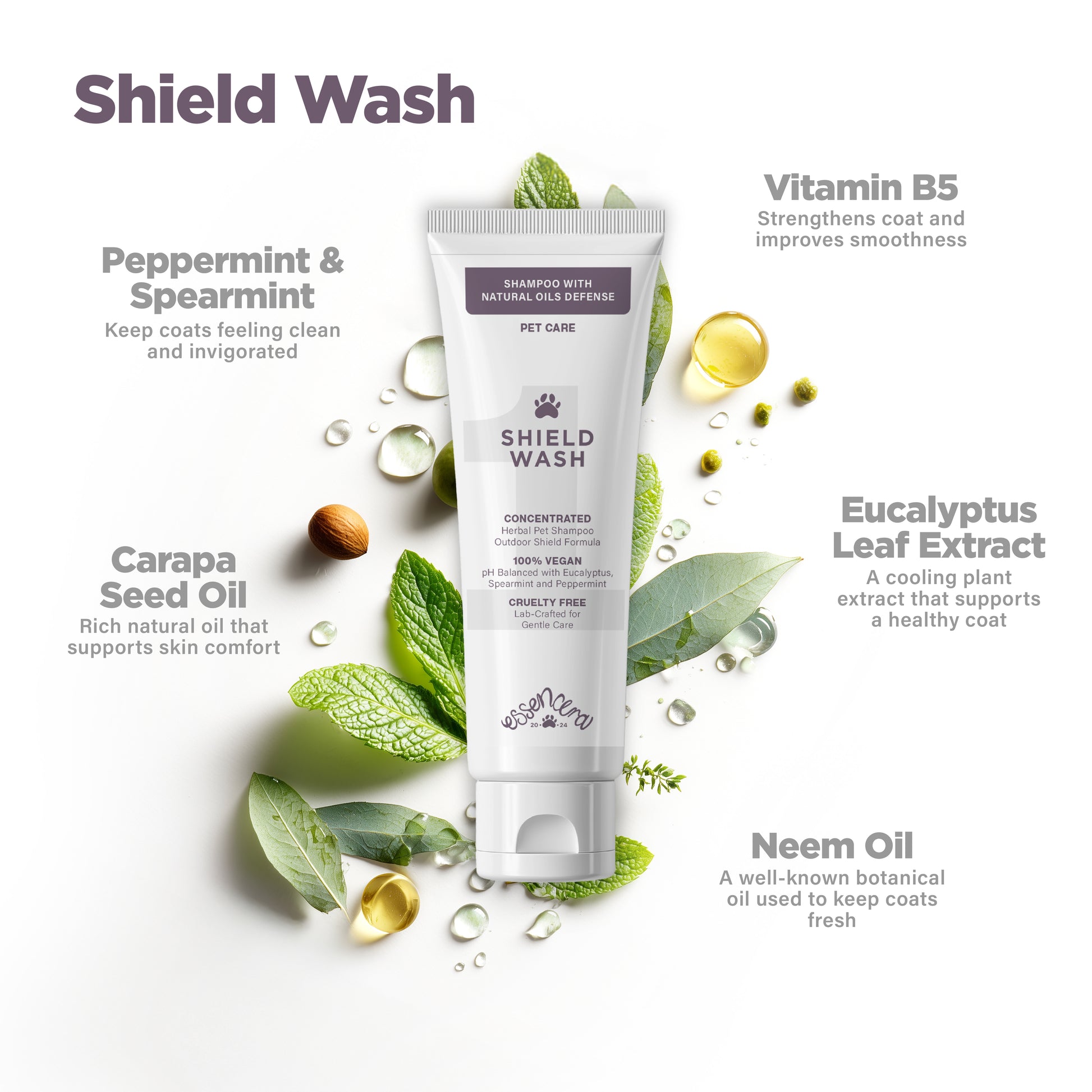 Outdoor dogs need something stronger than a standard shampoo. Sand, pollen, grass, lake water, beaches, trails, and parks can all cling to the coat. Shield Wash is formulated with plant based oils and herbal extracts traditionally known to help discourage pests while providing a deep gentle clean without stripping healthy natural oils.