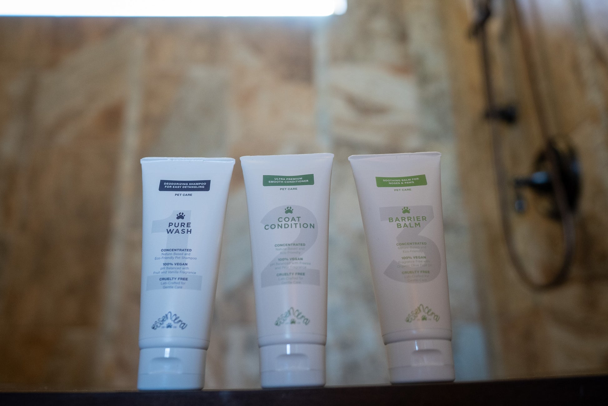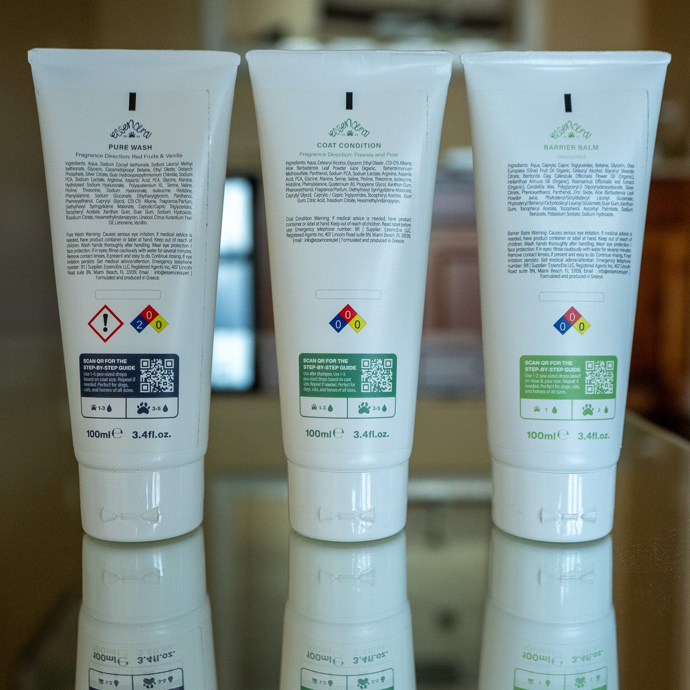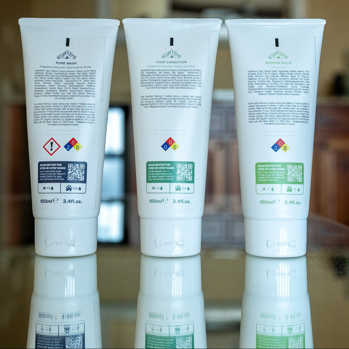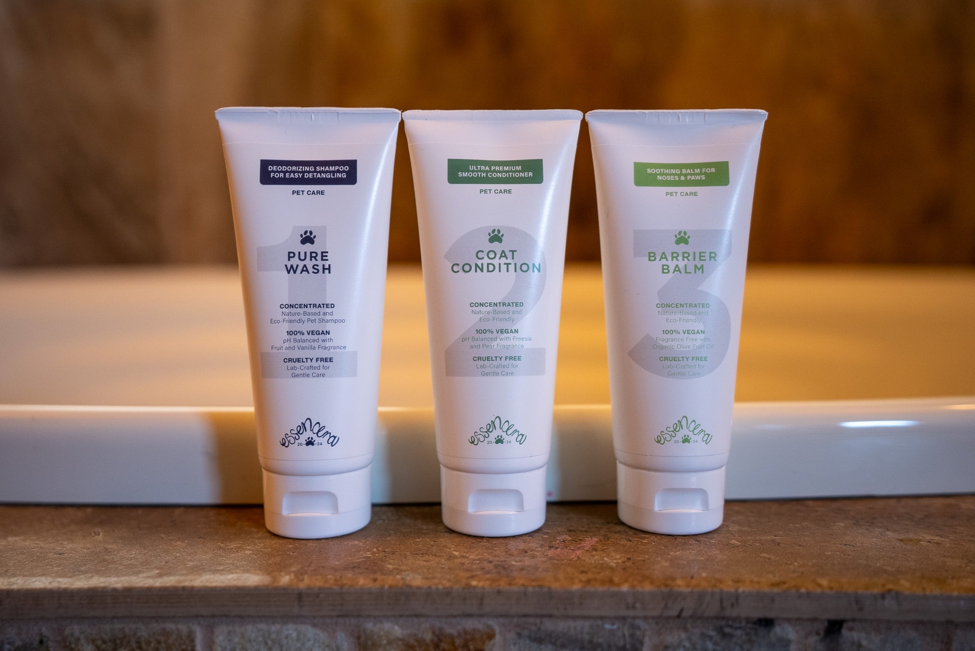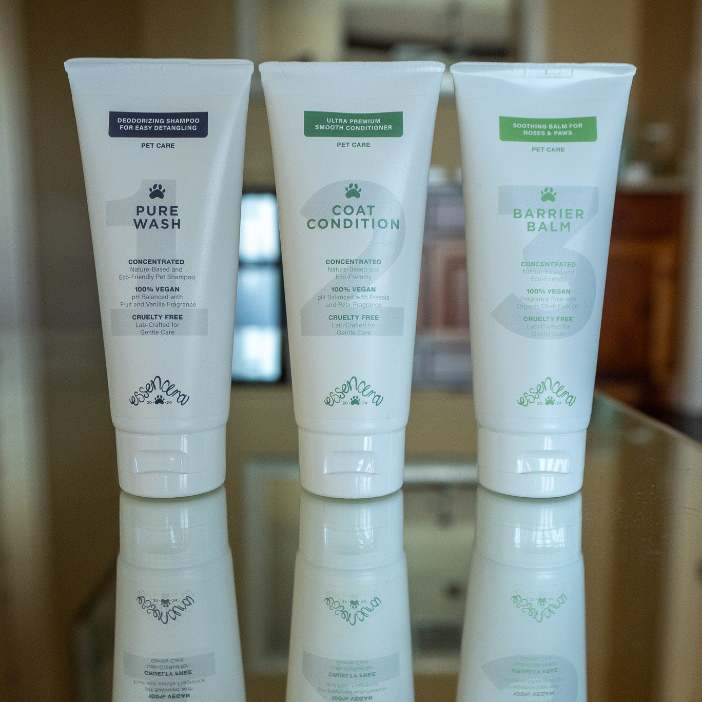 Start with Step 1: Pure Wash, our deodorizing shampoo crafted with red fruit and vanilla fragrance that gently lifts odors, detangles, and refreshes the coat.